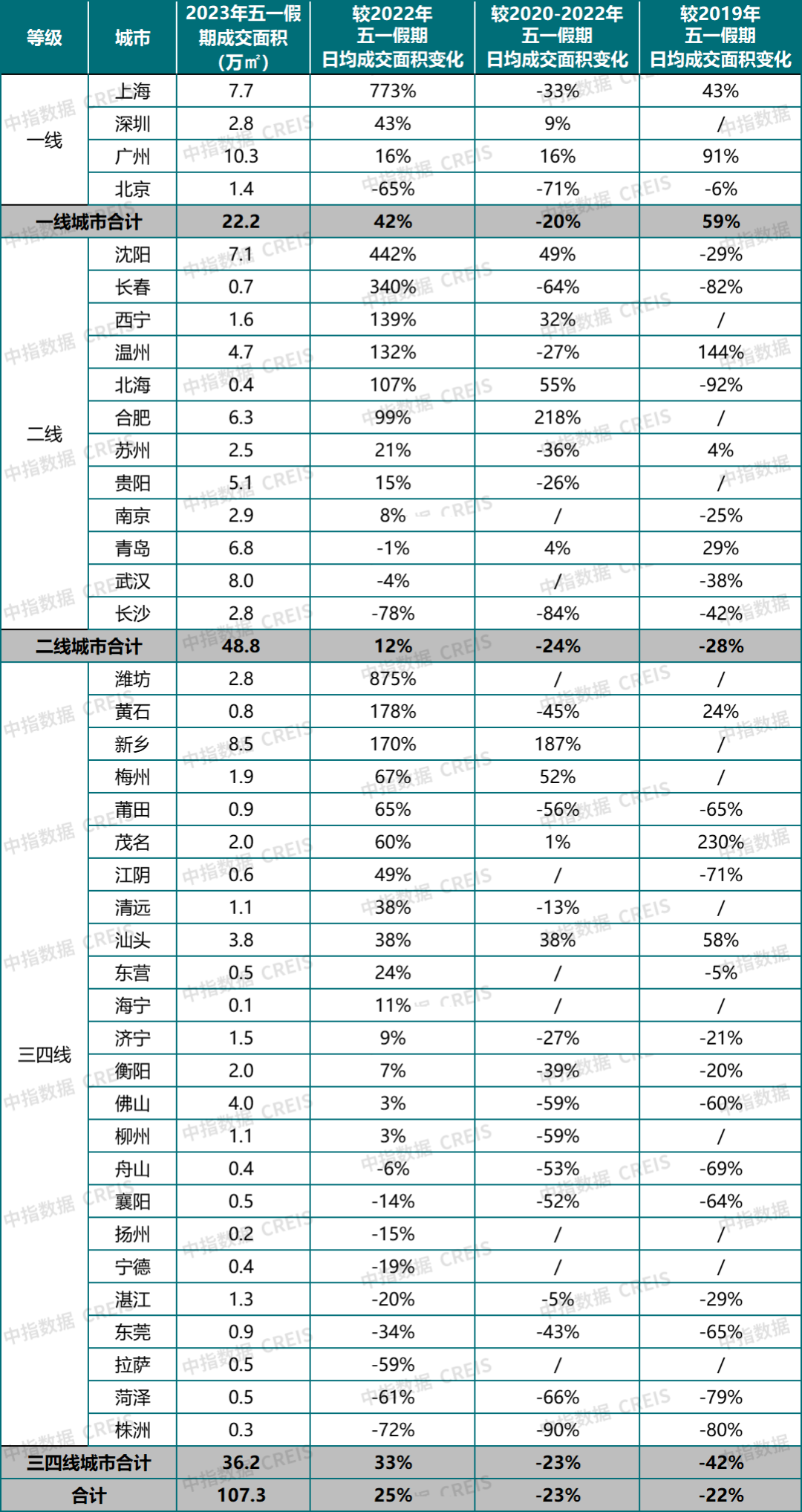 重点监测的三四线城市中,2023年五一假期成交面积合计36.2万平方米,较2022年五一假期上涨33%,较2019年五一假期下降42%,其中,舟山、襄阳、扬州、宁德、湛江、东莞、拉萨、菏泽、株洲的成交面积弱于去年五一假期。