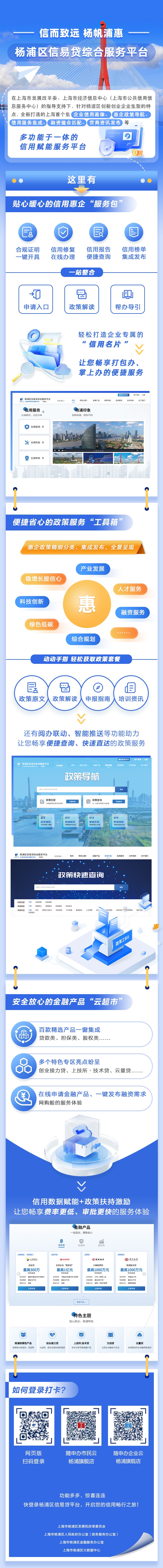 此次会上发布的区信易贷综合服务平台是杨浦区主动回应创新创业企业需求,全新打造的上海首个集企业信用画像、信用服务集成、惠企政策导航、融资撮合匹配、营商资讯发布等多功能于一体的信用赋能服务平台。
