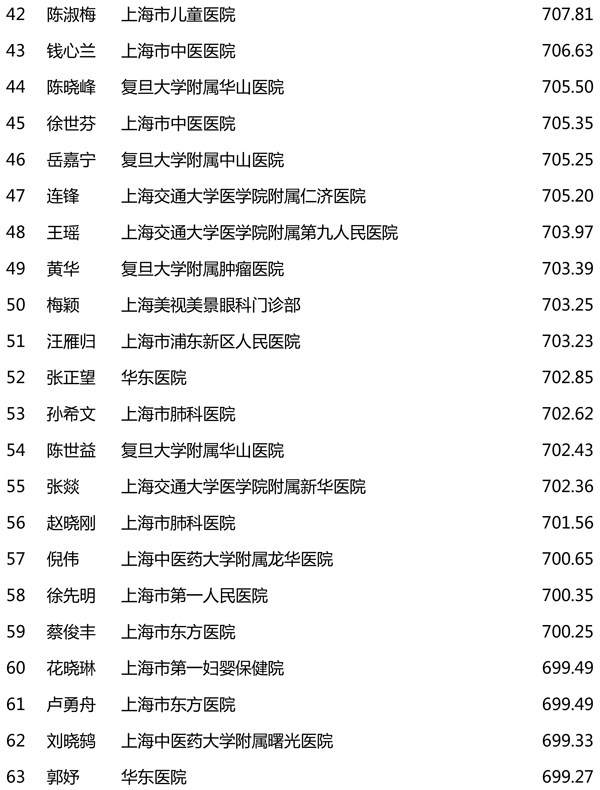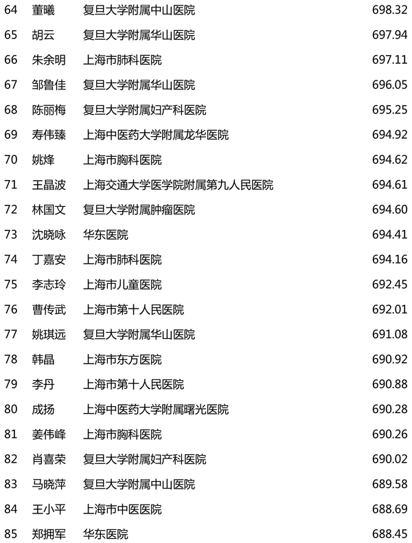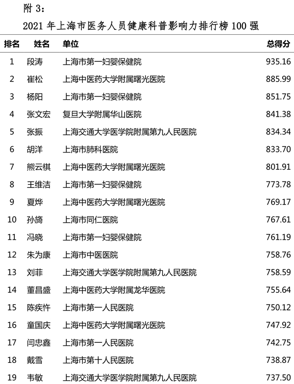 评价结果显示,复旦大学附属中山医院、上海交通大学医学院附属仁济医院、上海市第一妇婴保健院、复旦大学附属华山医院、龙华医院、市第一人民医院、曙光医院、上海市儿童医院、市第十人民医院、市胸科医院、同仁医院、第九人民医院、复旦大学附属肿瘤医院等入选医疗机构健康科普影响力指数排行榜50强;黄浦区打浦桥街道社区卫生服务中心、松江区泗泾镇社区卫生服务中心、奉贤区南桥镇社区卫生服务中心等入选社区卫生服务中心健康科普影响力指数排行榜50强;段涛、崔松、杨阳等入选医务人员健康科普影响力指数排行榜100强。