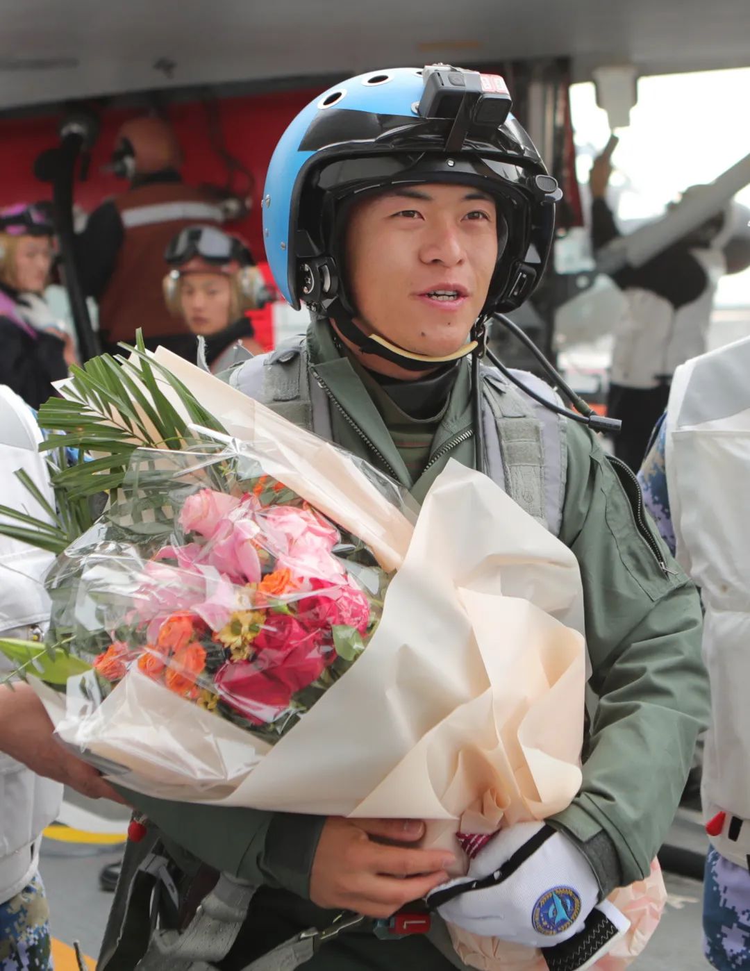 首位驾驶歼-15舰载战斗机在辽宁舰成功阻拦着舰的飞行学员张宇亮接收官兵献花。杨皓 摄