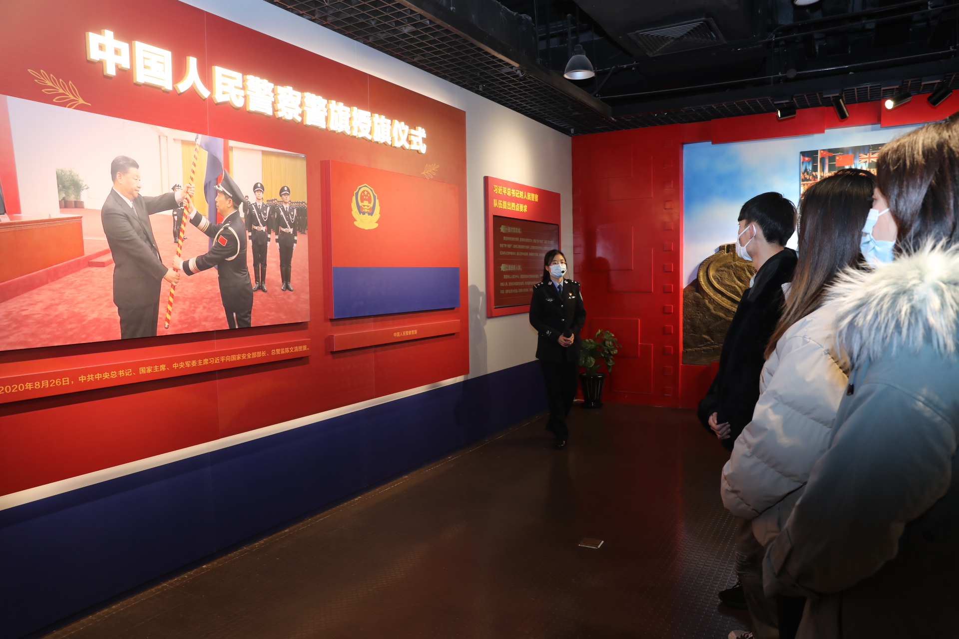 展厅内,“中国人民警察警旗授旗仪式”版面吸引不少观众驻足观看。“这张是习近平总书记向国家安全部部长、总警监陈文清授旗的照片,位于大屏幕右侧的展板上,展示了由红蓝两色组成的中国人民警察警旗、中国人民警察誓词”,在讲解员的介绍中,来自青浦区夏阳街道的尤女士更进一步了解了设立中国人民警察节的相关信息,她说:“参观后,我受到了学习和精神上的洗礼。在和平年代,中国人民警察队伍是牺牲最多,作出贡献的最多的队伍之一,从国家层面来设立这样的节日,是对他们的充分肯定”。