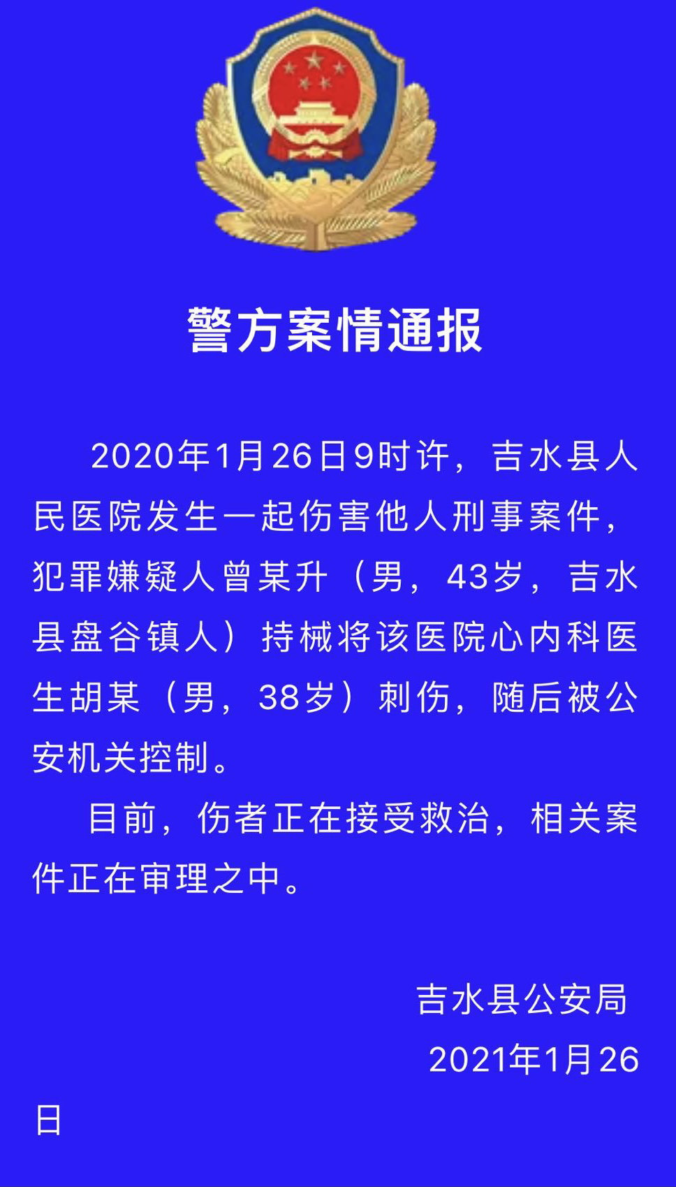 事后,当地警方发布通报称,1月26日9时许,吉水县人民医院发生一起伤害他人刑事案件,犯罪嫌疑人曾某升(男,43岁,吉水县盘谷镇人)持械将医院心内科医生胡某(男,38岁)刺伤,随后被公安机关控制。目前,伤者正在接受救治,相关案件正在审理之中。