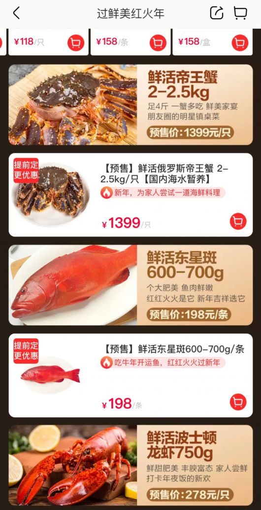 小松来到盒马鲜生平高店,在这里,采购烹饪食材及礼品的市民较多。小松在现场看到,波士顿龙虾、帝王蟹、东星斑等许多海鲜都已开启预售,还可以提供火锅食材外送到家服务。除此之外,今年盒马还供应团圆年菜半成品套餐,供市民选择。