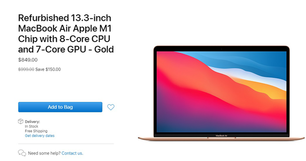 苹果官网上架M1 MacBook Air翻新版:比新版便宜近千元