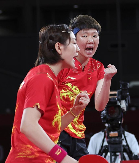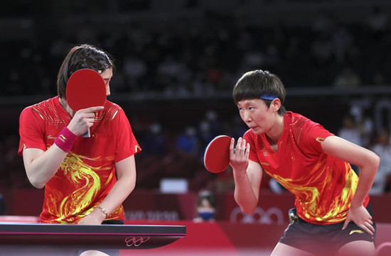 陈梦(左)与王曼昱商量战术 新华社图