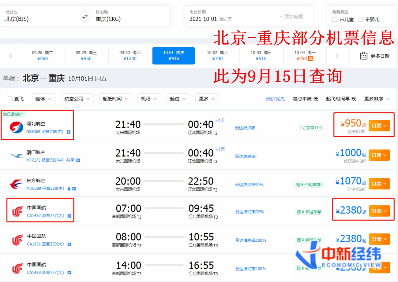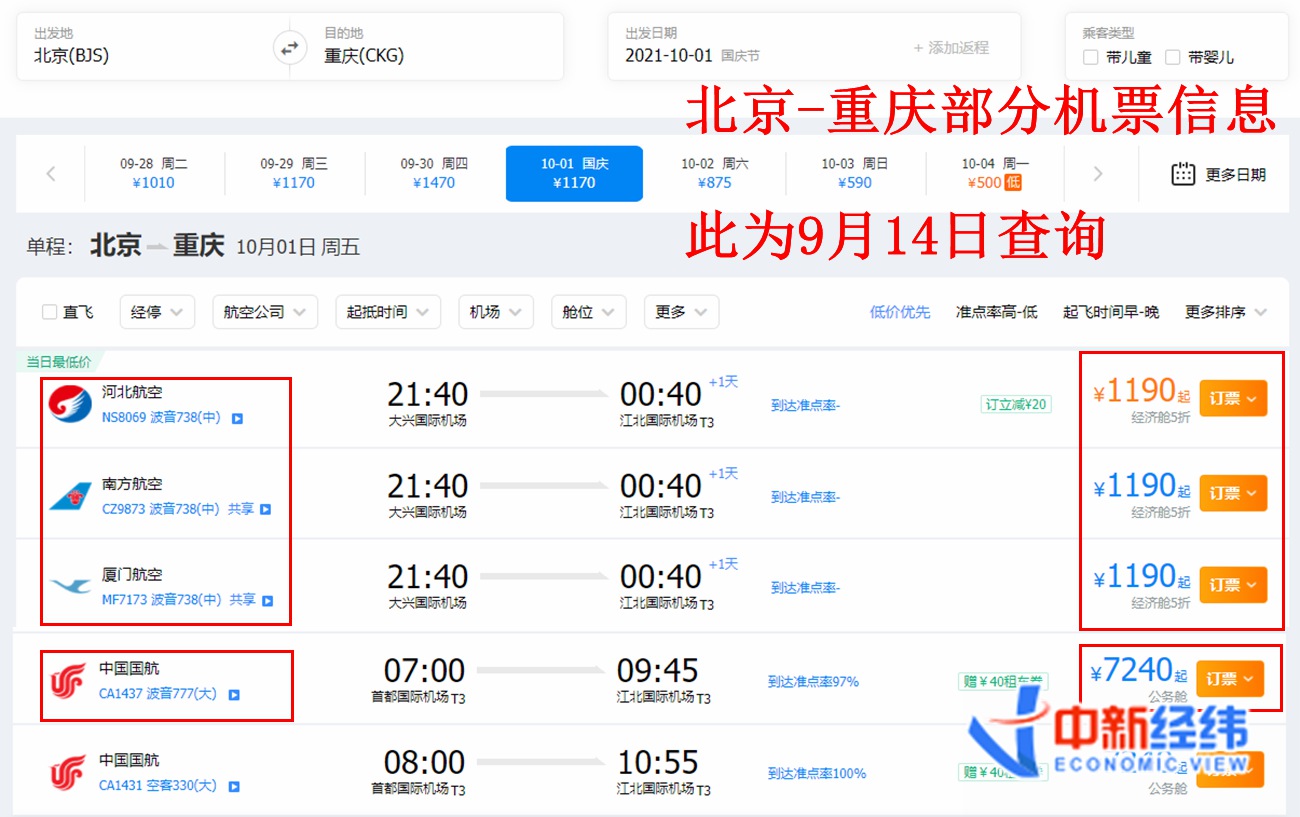 如:9月14日,中新经纬客户端查询第三方购票平台,10月1日北京-重庆的航班信息显示,当日最低机票价格为1190元(机票价格均不含燃油附加费),航班有河北航空NS8069、南方航空CZ9873、厦门航空MF7173三个班次;公务舱方面,中国国航的CA1437航班机票价格高达7240元。