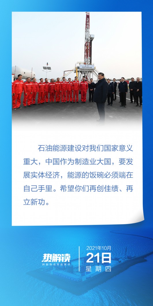 热解读10月21日下午,正在山东省东营市考察调研的习近平总书记来到胜利油田,登上钻井平台,察看作业情况,看望慰问石油工人。
