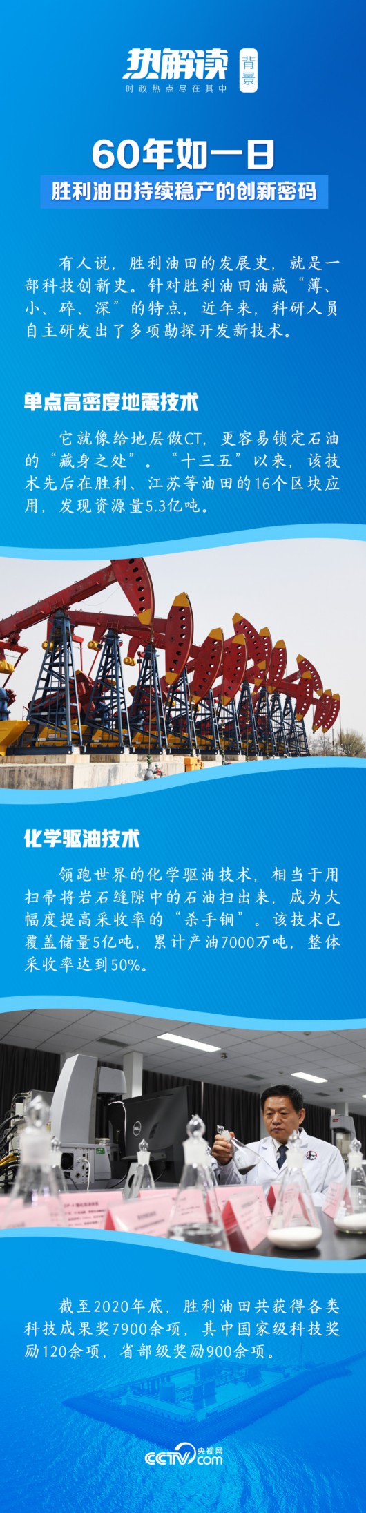 总书记此次专程考察的胜利油田正是我国能源领域持续推进科技创新的一个缩影。一代又一代石油人,从创业走向创新,用科技为祖国发掘石油。60年来,胜利油田发现81个油气田,累计生产原油超过12亿吨,约占同期全国陆上原油总产量的五分之一,创造了老油田持续稳产的奇迹。
