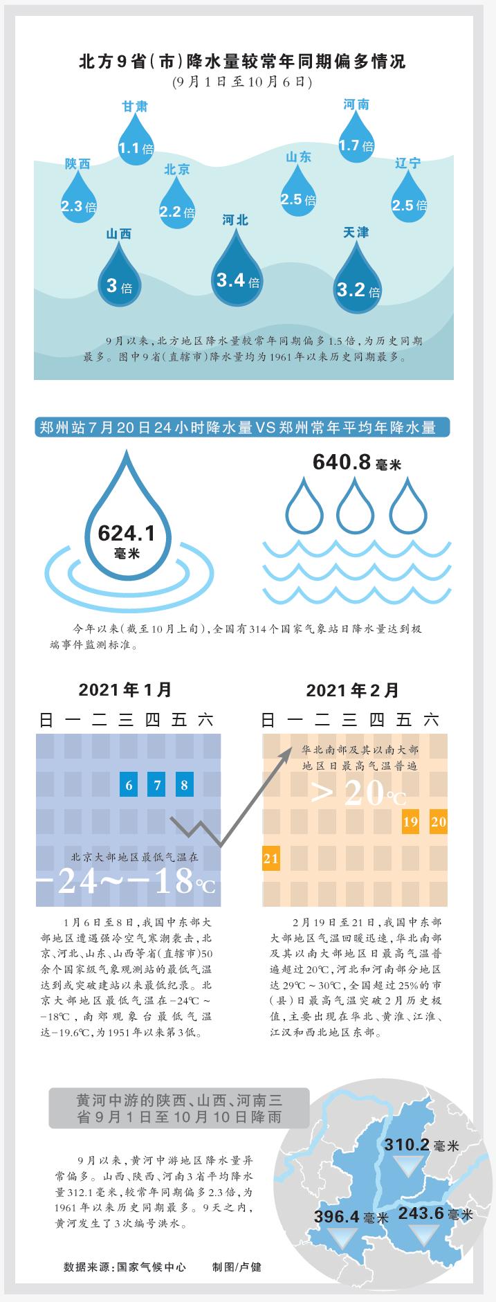 随后的几乎每个月,都有极端天气出现——春季北方遭遇近10年来少有的强沙尘暴;4月至9月,我国出现中等强度以上龙卷风次数17次,超常年平均;7月,郑州最大小时降雨量突破我国内陆地区历史极值;9月至10月上旬,北方地区降水量为1961年以来历史同期最多……