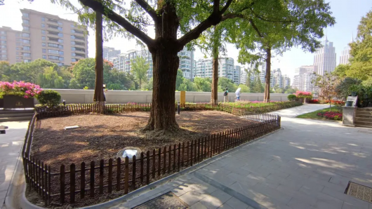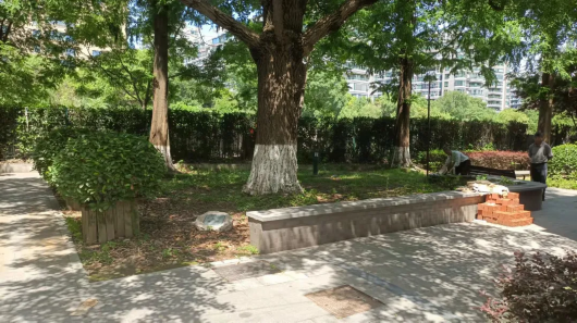 对此,市、区古树管理部门多次前往现场勘查调研,确定了在古树保护区(树冠垂直投影外5米)范围内使用透水透气铺装,增加排水设施和全人工作业以此保护地下根系;调整古树下种植的灌木和地被、对古树周边的乔木进行修剪等景观提升措施。