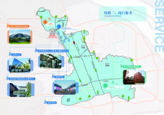 路线:虹桥商务区核心区:虹桥商务区公共事务大厦展示中心——龙湖天街——万科中心——虹桥天地——闵行虹桥进口商品展示交易中心——新虹桥国际医学园区——交大——南加州大学——华师大——里昂商学院——华师大——以色列海法大学