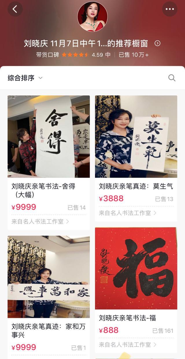 11月7日,刘晓庆开设直播间,出售自己的书法真迹。从商品橱窗可以看到:“福”888元,“莫生气”3888元,“家和万事兴”9999元,还附上自己亲笔签名。
