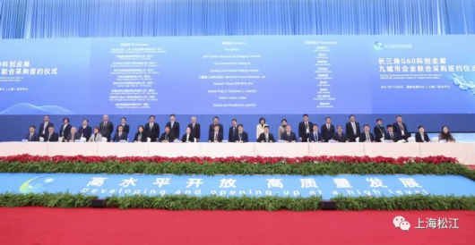 会上,九城市共同成立了长三角G60科创走廊科技成果转化基金,成立了长三角G60科创走廊专精特新中小企业协作联盟,为首批13家长三角G60科创走廊产融结合高质量发展示范园区授牌。长三角G60科创走廊联合工信部工业信息安全发展研究中心和上海质量管理科学研究院共同发布了《长三角G60科创走廊工业互联网一体化发展报告》,发布了“G60星链”计划,发布了G60脑智科创基地阶段性建设成果。九城市企业本届进博会联合采购9个代表性项目现场进行了签约,G60跨区域合作项目进行了现场签约,中国电信、中国联通、腾讯、航天宏图、上海飞机设计研究院、顺丰丰图科技等一批重大战略合作项目集中签约。