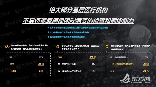 权威数据显示,目前我国87%的糖尿病患者大多就诊于县级及以下医疗机构,但这类医疗机构却往往不具备糖网诊疗能力。《报告》显示,在此次接受调研的基层医生和医疗机构中,有75%的单位没有相关检查设备,并且具备确诊病情能力的医疗机构仅有18%。