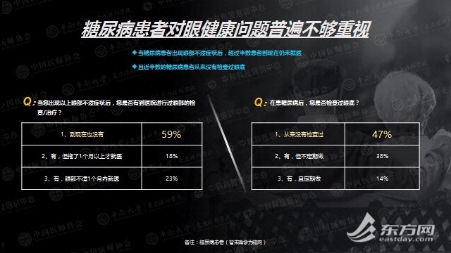 统计数据表明,在已确诊糖尿病的患者中,仍有33%的用户不了解糖尿病会引发相关的眼部并发症,并有可能导致失明。令人触目惊心的是,有47%的糖尿病患者从未检查过眼底,甚至在眼部出现不适症状后,仍有59%的人没有到医院进行眼部检查和治疗。