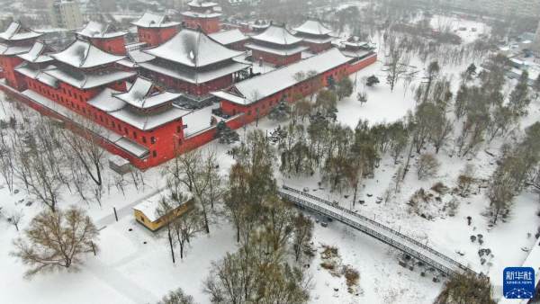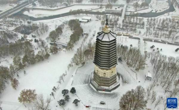 11月22日在沈阳市浑南区白塔公园拍摄的雪景(无人机照片)。当日是“小雪”节气,辽宁沈阳市出现降雪。新华社记者 杨青 摄