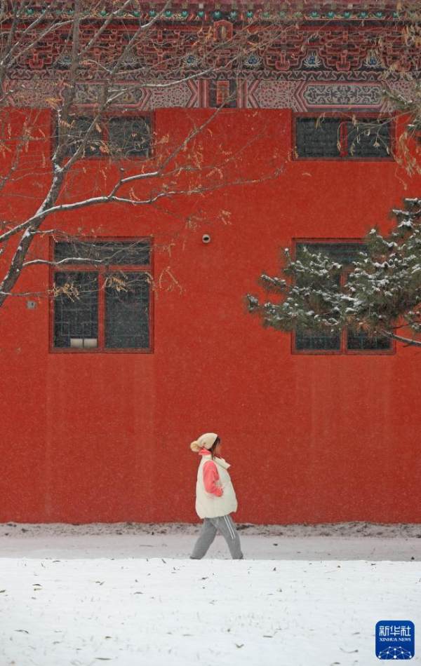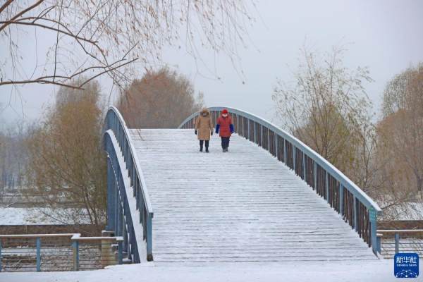11月22日,在沈阳市浑南区白塔公园,市民在雪中行走。当日是“小雪”节气,辽宁沈阳市出现降雪。新华社记者 杨青 摄