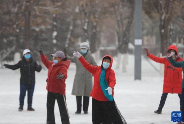 11月22日,在沈阳市浑南区白塔公园,市民在雪中跳舞锻炼。当日是“小雪”节气,辽宁沈阳市出现降雪。新华社记者 杨青 摄