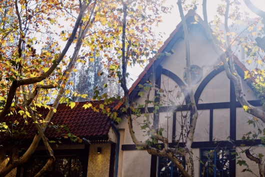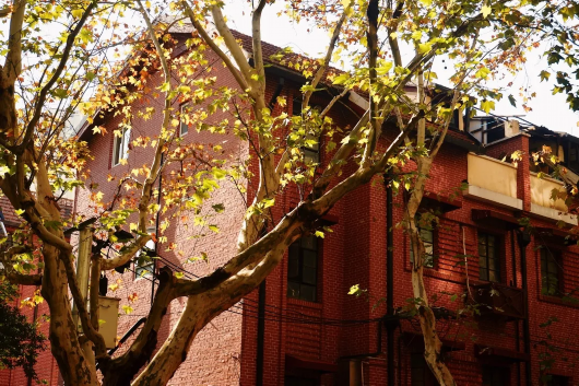 落叶是这个时节特有的景色。阳光透过焦黄的梧桐叶,倾泻于老洋房上,光与影之间,新华路更添一份韵味。