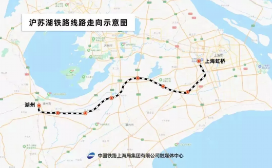 沪苏湖铁路起自上海虹桥站,途经江苏省苏州市,终至浙江省湖州市湖州站,设上海虹桥、松江南、练塘、汾湖、盛泽、南浔、湖州东(纳入湖杭铁路工程)、湖州8个车站,其中上海虹桥站和湖州站为既有车站,其他为新建中间站。