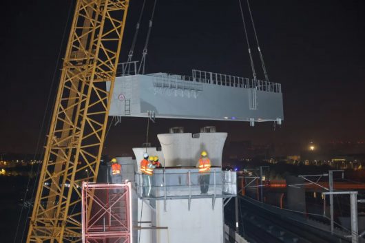 11月23日凌晨,随着最后一片钢横梁架设到位,江苏南沿江城际铁路上跨宁杭高铁13榀钢横梁吊装施工顺利完成。目前,项目正进行南沿江城际铁路站前5标8千米滆湖段施工,预计12月底该标段连续梁全部合龙,明年1月上旬箱梁架设全部完成
