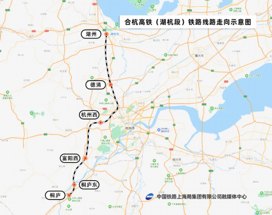 合杭高铁湖杭段是2022年杭州亚运会重点配套工程和“轨道上的长三角”重要节点工程,线路从既有宁杭高铁湖州站引出,经湖州市南太湖新区、吴兴区、德清县,杭州市余杭区、西湖区、富阳区和桐庐县,跨富春江经新设桐庐东站后引入杭黄高铁桐庐站,设计时速350公里,新建线路长约136公里