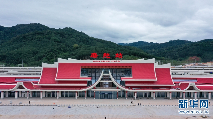 磨憨站。建筑面积约1.6万平方米,车站依山而建,以“泛亚新口岸、山水映磨憨”为设计理念,站房外立面以红色和白色为主色调,美观大气。站房整体造型则提取当地传统建筑元素,三段式、多层坡屋顶构成的立面墙体层叠起翘,古朴灵动,亦站亦景(摄于11月26日)。