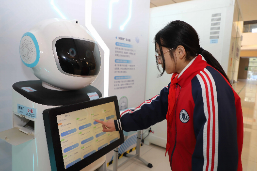 闵行区教育学院附属友爱实验中学智能机器人基于不同学生的错题信息,依托系统配题,生成学生个性化专属作业本。图为学生正在打印个性化作业本