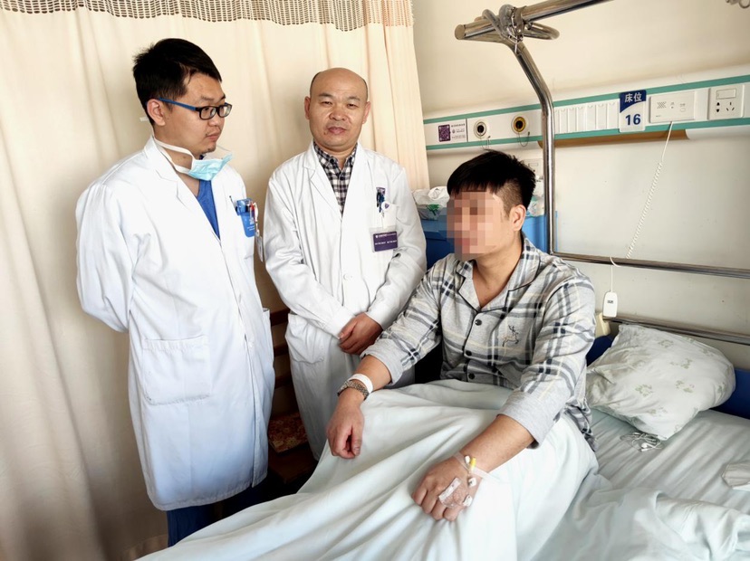 主刀医生何博(中)、手术第一助手臧雨峰(左)正在查房