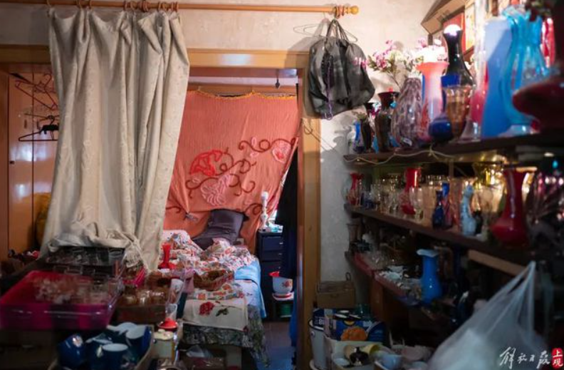 30平米见方的空间,除了一张床和容一人侧身勉强通过的走道,其他空间如俄罗斯方块游戏一般,整齐地高高码放起了各种产自上世纪70-80年代上海的旧物,其中玻璃器皿占了90%以上的比例。