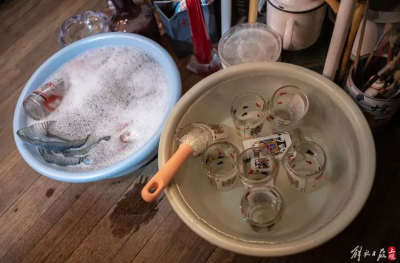 很多中古店的老板也是老朱的长期客户,一来都是拎一大包走。在老朱这里30元一只的杯子,经过反复淘洗,擦干,变得如崭新一般,几乎看不出岁月痕迹。复古造型和花饰的杯子摆在网红街区的时髦中古店里,瞬间身价翻上好几倍。常常东西当天上架当天就卖空,也无怪乎老板们喜欢来老朱这里批量采买。