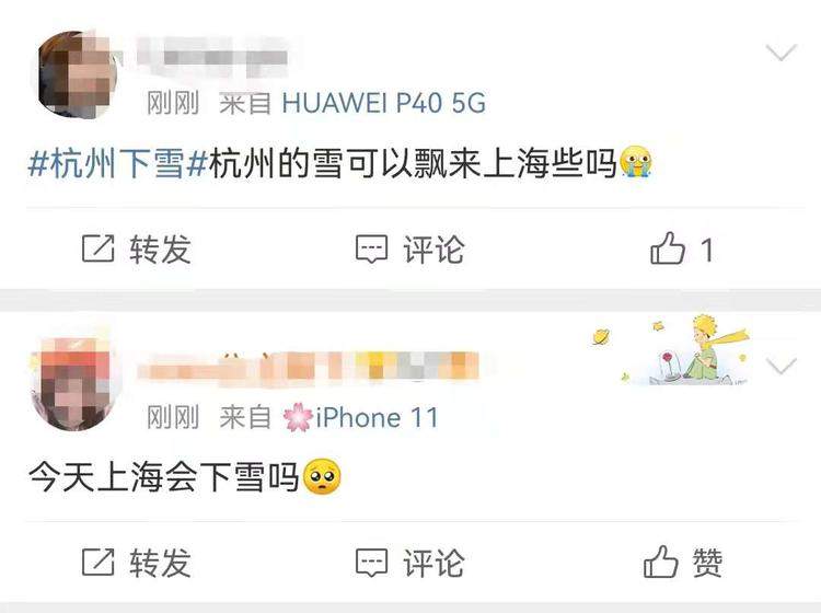 出门冻到瑟瑟发抖的同时,也有一大波人无比兴奋,因为——真的在上海看到了飘雪!