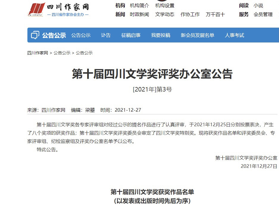 12月27日晚,四川作协官网“四川作家网”对外公布第十届四川文学奖获奖名单。奖项分为“长篇小说”、“中短篇小说”、“诗歌”、“散文”、“报告文学”、“儿童文学”、“文学理论批评”、“文学翻译”,8个类别共有16部(篇)作品获奖。其中长篇小说奖2部、中短篇小说奖3篇(部),诗歌奖3部,散文奖3部,报告文学奖2部(篇),儿童文学奖1部,文学理论评论奖1部(篇),文学翻译奖1部。四川文学奖每三年评选一次。第十届四川文学奖的评审组,分8个类别共有34位评委。