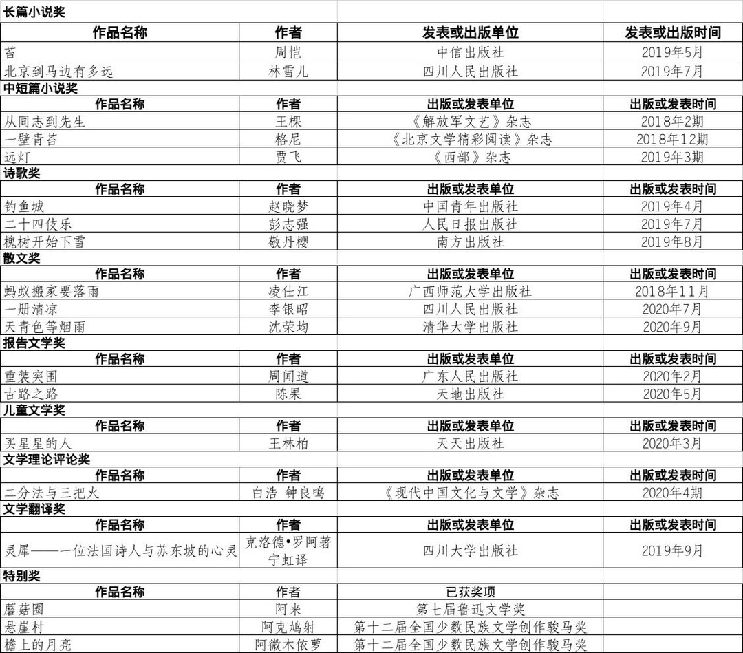 在获奖名单上可以看到,在“长篇小说”类别,乐山籍90后作家周恺的《苔》、同样为乐山籍作家的林雪儿的《北京到马边有多远》榜上有名;在“中短篇小说”类别,军旅作家王棵的《从同志到先生》,格尼的《一壁青苔》,贾飞的《远灯》在列;在“诗歌类”类别, 赵晓梦《钓鱼城》、彭志强《二十四伎乐》,敬丹樱《槐树开始下雪》获奖;凌仕江《蚂蚁搬家要落雨》、李银昭《一册清凉》、沈荣均《天青色等烟雨》是“散文”类别的获奖作品;周闻道《重装出围》、陈果《古路之路》是“报告文学”类别的获奖作品;唯一的“儿童文学”类别由王林柏《买星星的人》获得;“文学理论批评”也是只有一部作品获奖:白浩和钟良鸣的《二分法和三分火》。“文学翻译”类别的唯一获奖作品是《灵犀:一位法国诗人与苏东坡的心灵交会》。