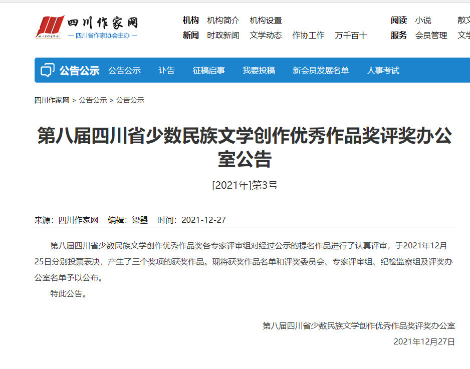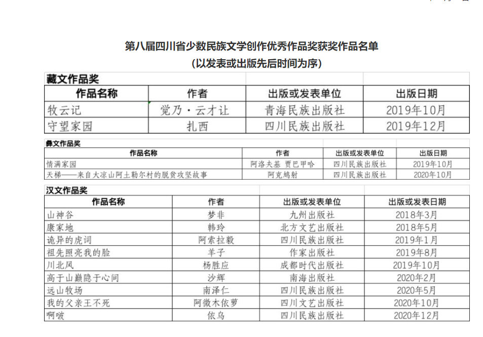 与第十届四川文学奖获奖名单揭晓同时,第八届四川省少数民族文学创作优秀作品奖也揭晓了获奖名单。四川省少数民族文学创作优秀作品奖也是每三年评选一次。本届一共有13件作品获奖。