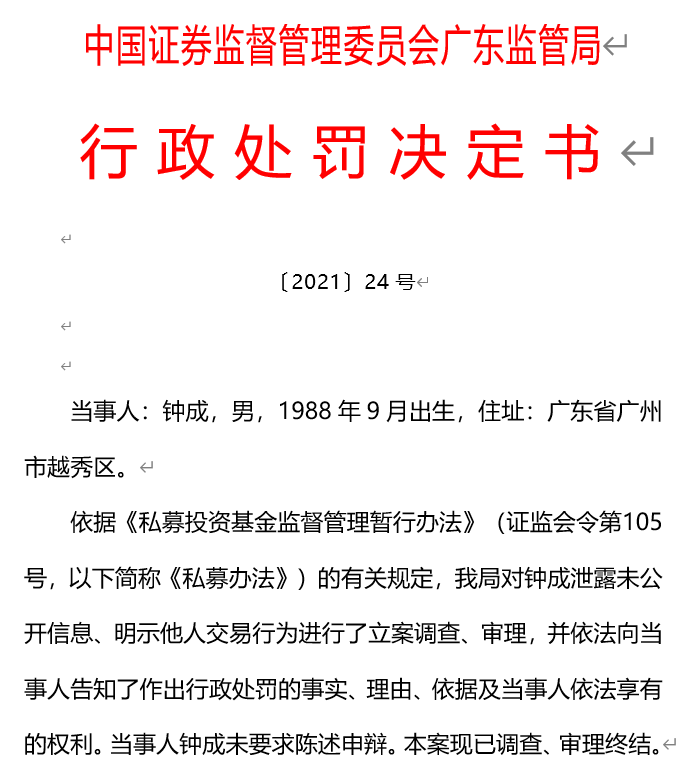 近日,中国证监会广东监管局网站公布的行政处罚决定书显示,依据《私募投资基金监督管理暂行办法》(证监会令第105号,以下简称《私募办法》)的有关规定,广东证监局对钟成泄露未公开信息、明示他人交易行为进行了立案调查、审理。