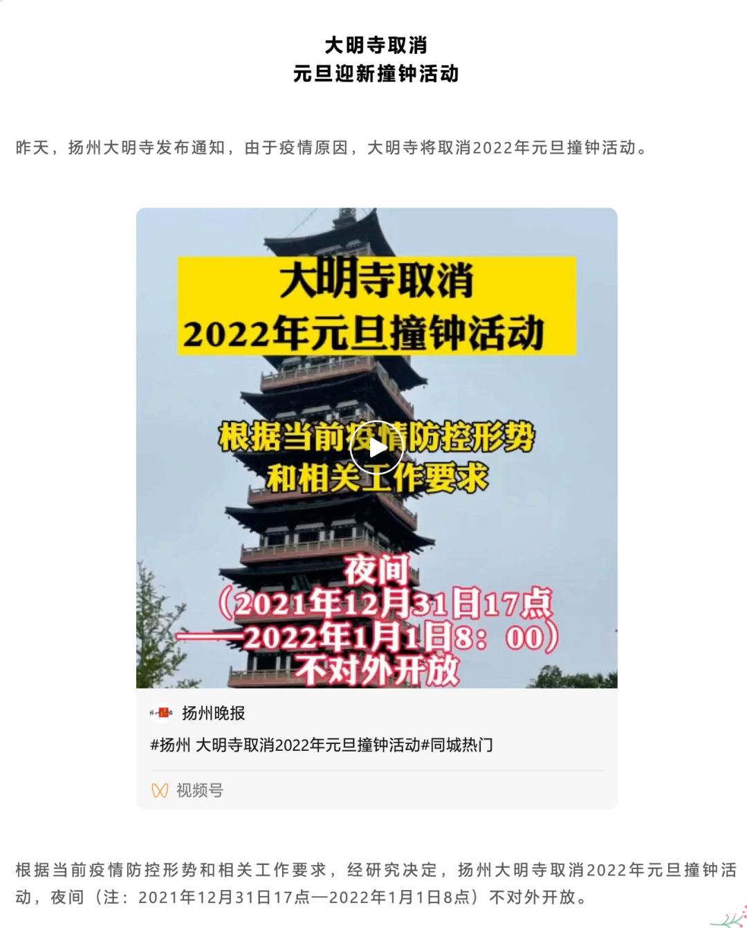 扬州:大明寺取消元旦迎新撞钟活动
