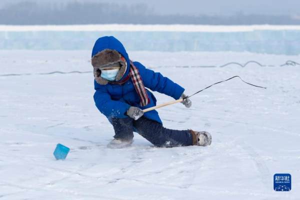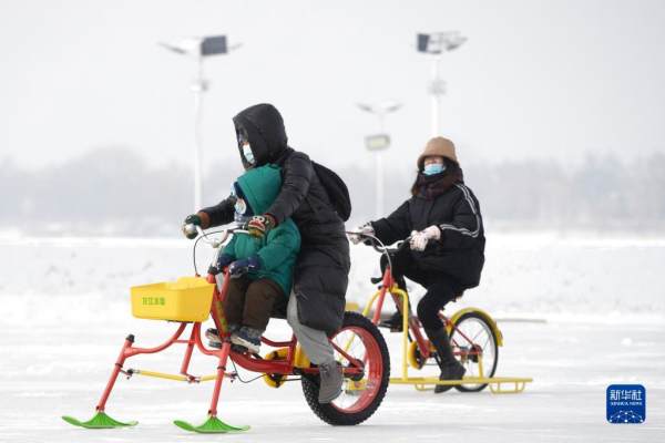 12月30日,在松花江哈尔滨段江面上,游客在体验冰上娱乐项目。