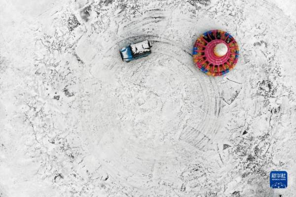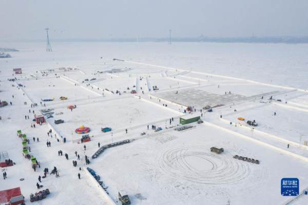 12月30日,在松花江哈尔滨段江面上,游客在体验冰上娱乐项目(无人机照片)。