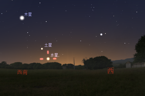 这次水星东大距观测条件还算可以,对北京地区来说,日落时,水星的地平高度有14度,天黑下来可以观测时的高度在8度上下,在天气晴好的情况下,借助双筒望远镜完全有机会观测到它。用照相机拍照成功的可能性更大,如果用焦距50毫米以下的镜头,还可以同时把木星、土星拍摄下来。因为此时,木星、土星也在西南方天空中,和水星一起分布在25度左右不大的范围内。1月4日-6日,一轮弯弯的月牙儿也会加入它们的行列,依次从水星、土星、木星的左侧经过,形成所谓“三星伴月”的天象,更是给这四个著名的天体合影的好机会。