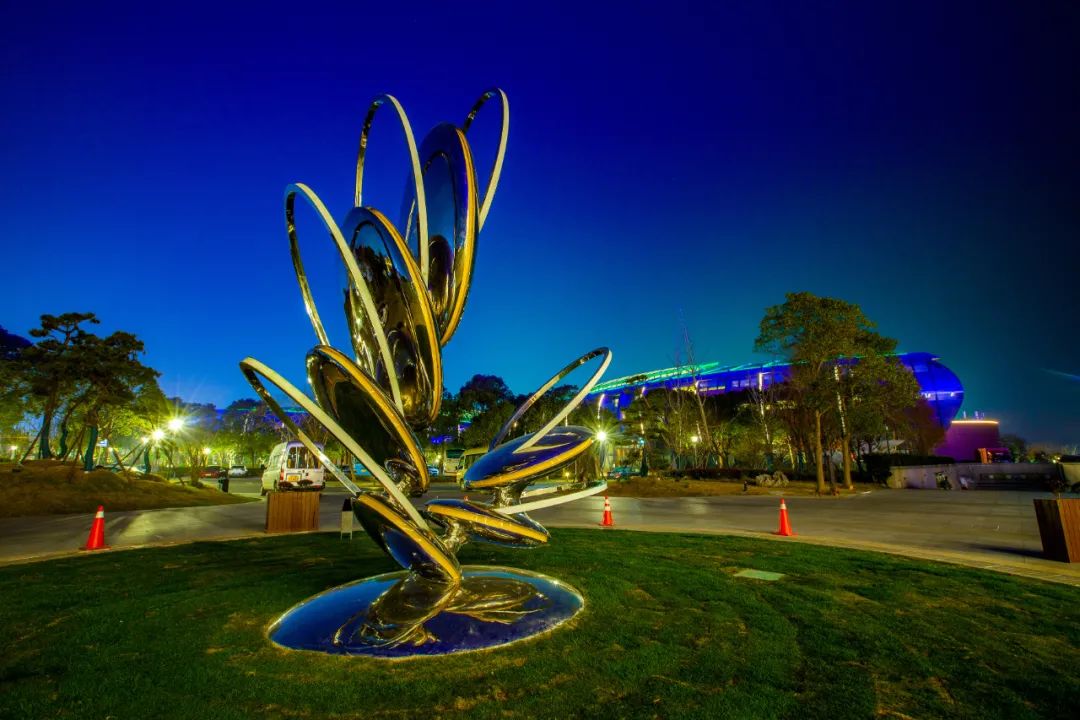 滴水湖会议中心主入口前,《回》以“一花一叶”的姿态绽放。作品以“水”为创作元素融入其中,为“一花一叶”增添了生命的源泉,与周围建筑形成呼应,水花层层跃起的动势象征着活力与激情,同时也寓意着蓬勃发展和创新的理念。