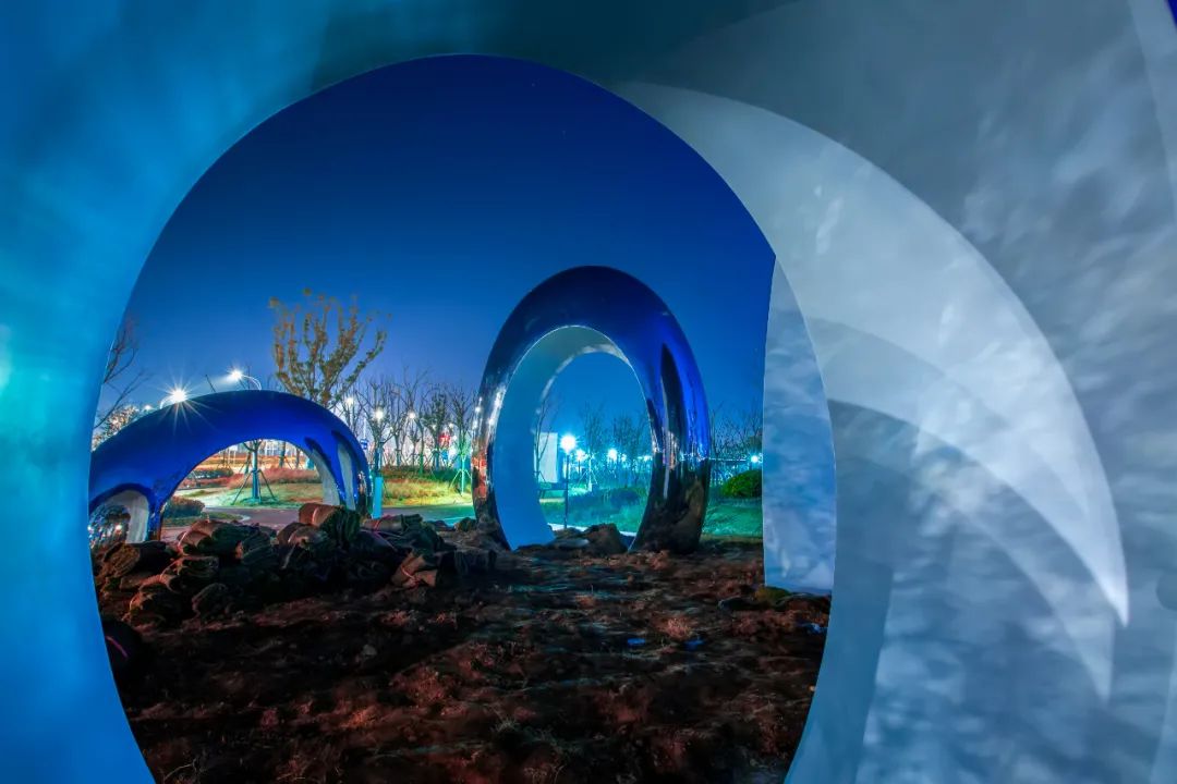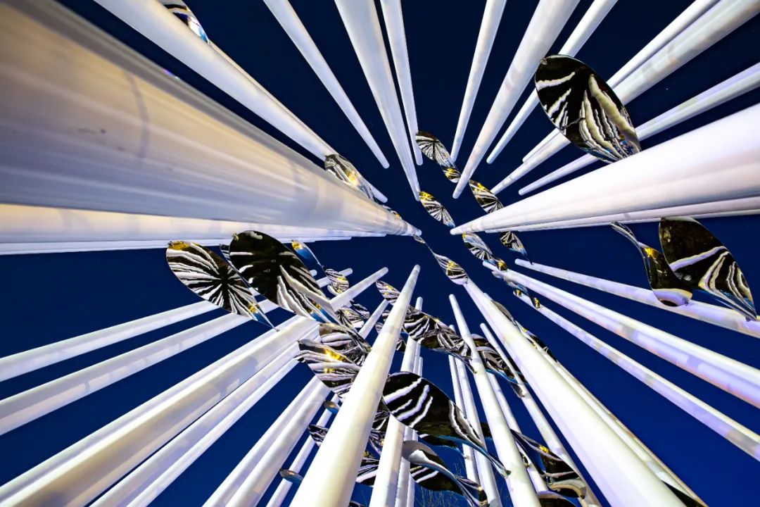 年轻的创作者充分运用了数字化编程和声光电的艺术效果,对水花激起的瞬间动态进行抽象形态变化,水花在层层叠叠中被赋予科技动态。白天,镜面不锈钢在光线的照耀下熠熠生辉;夜晚,层层环绕的动态灯光成入夜精灵。