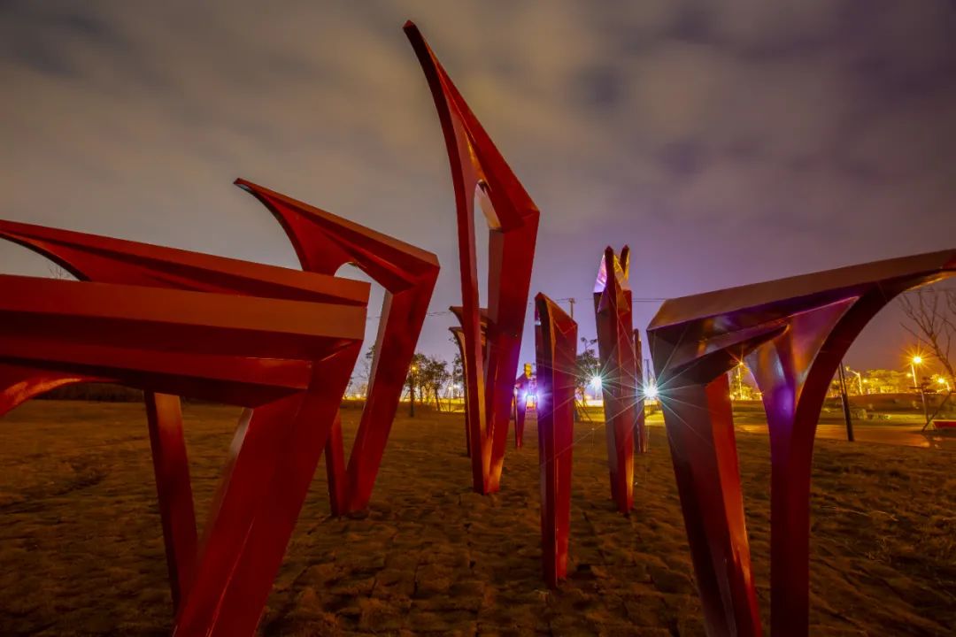 在南港大道与环湖西二路公园绿地,《千帆竞渡》在冬日泛着清黄的绿地上撑起一片“中国红”,大小不一的片片风帆正迎着寒冬,带着临港的重托,驶向未来。