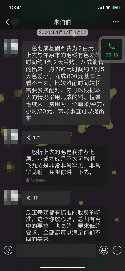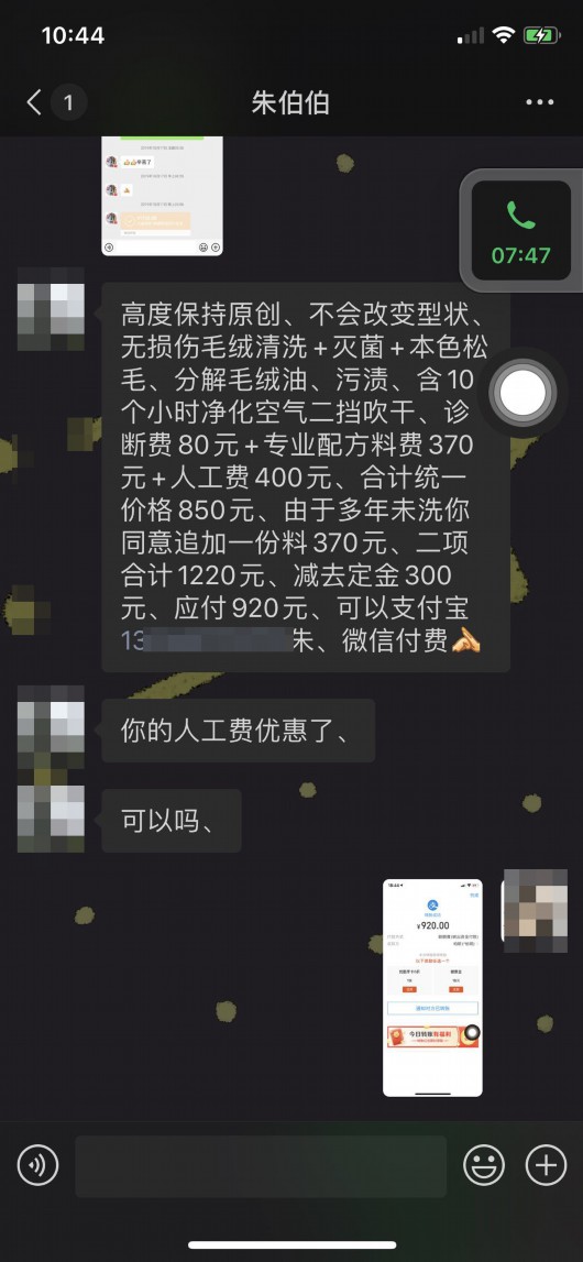 “我联系他修复,说想补一块布,问他大概需要多少钱,他说850元,我觉得有一点点贵,但也可以接受。”小北说,这是她和朱伯明一开始沟通的情况,却没想到这只是“无底洞”的开始。