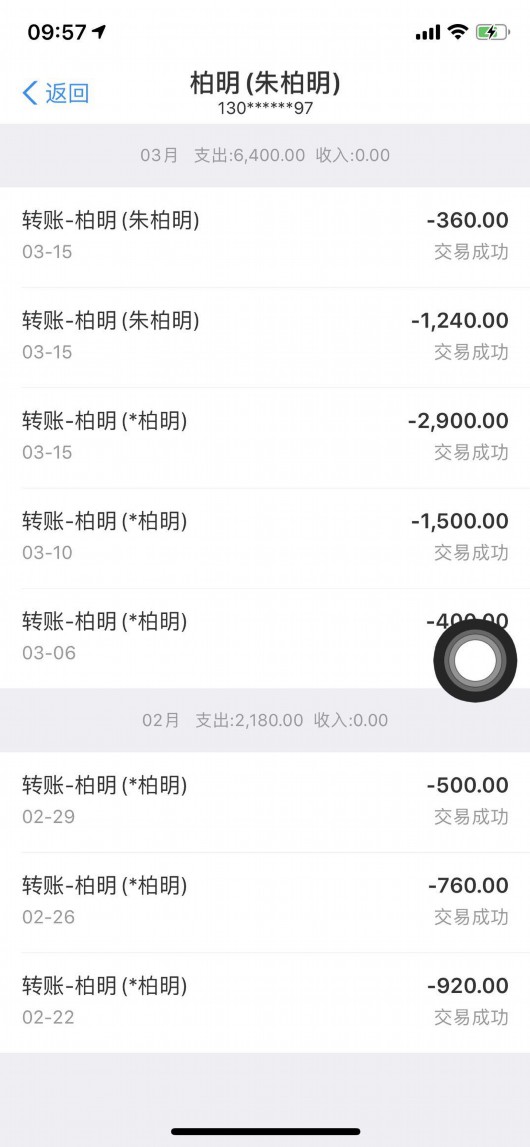 小北给朱伯明的部分支付宝转账记录,2020年3月15日一天转账4500元。受访者供图
