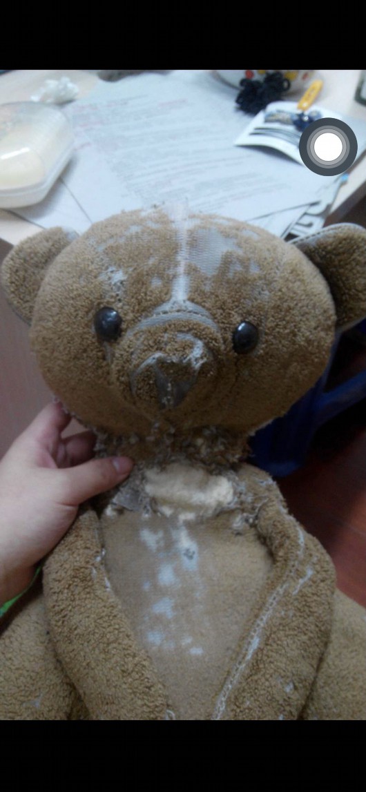 但20多岁的小熊已不可逆地“变老”了, 许多地方“变秃”,鼻子塌陷,四肢绵软,还有许多破损的地方。