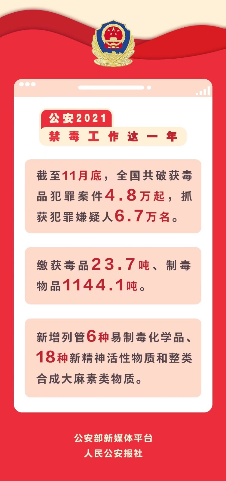 ——截至11月底,全国共破获毒品犯罪案件4.8万起,抓获犯罪嫌疑人6.7万名,缴获毒品23.7吨、制毒物品1144.1吨。