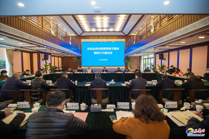 随后举行的座谈会上,江宁区农业农村局局长焦珍山全面汇报了2021年全区农业农村工作及2022年发展思路。2021年,江宁区深入落实中央和省市区决策部署和农村工作会议精神,聚焦富民产业、乡村建设、农村改革等重点工作,深入实施乡村振兴战略,全力发展优质稻米、都市花卉等优势特色产业链,新增1.2万亩高标准农田,农业综合机械化水平达91%,农业龙头企业年销售额突破920亿元、农业电商年交易额超过18亿元;强化环境整治,建成15个省级特色田园乡村,美丽宜居乡村建成率达100%,全年农业旅游综合收入超过66亿元、接待游客超过1300万人次,完成22个总投资41.3亿元的农业农村重大项目建设;强化乡村治理,全面完成193个涉农村(社区)产权制度改革任务,推动农民生活富裕富足。江宁区副区长张道平从乡村规划、配套政策、设施农业、规模化生产、高标准农田建设五个方面提出了农业农村发展路径。区委副书记张思明就“紧扣市对区考核要求,紧紧抓住乡村振兴样板工程办大事”“紧扣江宁区位优势,走出一条乡村振兴发展新路”“赋能强基、赋能做大,为乡村振兴赋新动能”三方面进行了补充。