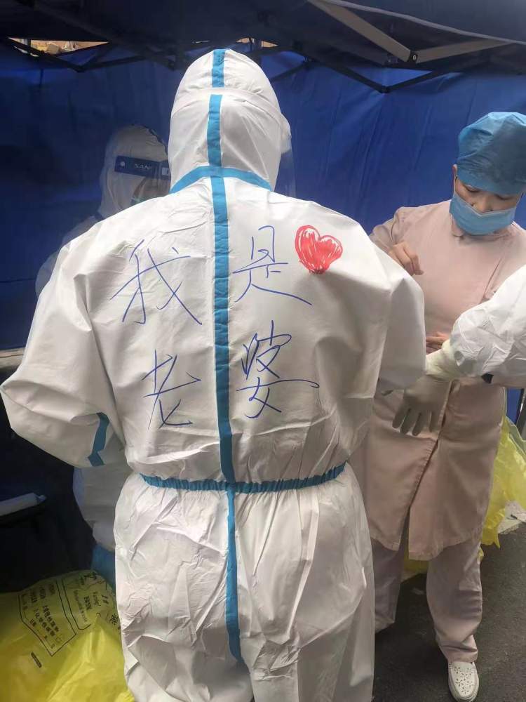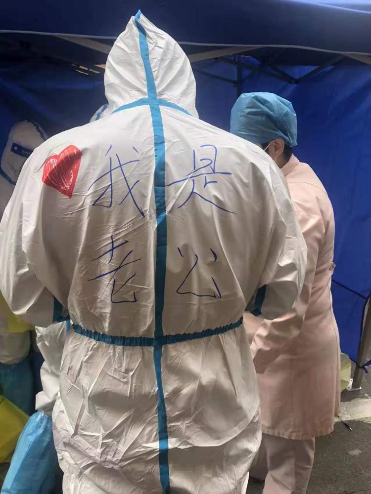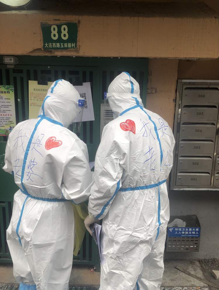 这时,玉三居委会的一位工作人员,看到眼前这珍贵的“夫妻同框”的画面,悄悄地用红笔在他们防护服的后背,各自画了一颗红色的桃心,还帮他们各自写上“我是老公”“我是老婆”的“自我介绍”。然而,两位主角本人却并不知情,直到现场所有人的手机都对着他们疯狂拍照的时候,俩人彼此一看,有点不好意思地笑了。
