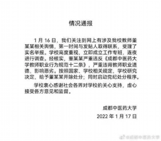 1、近日,有网友称成都中医药大学教师董某性侵一名女大学生,校方昨天声明,已开除董某。